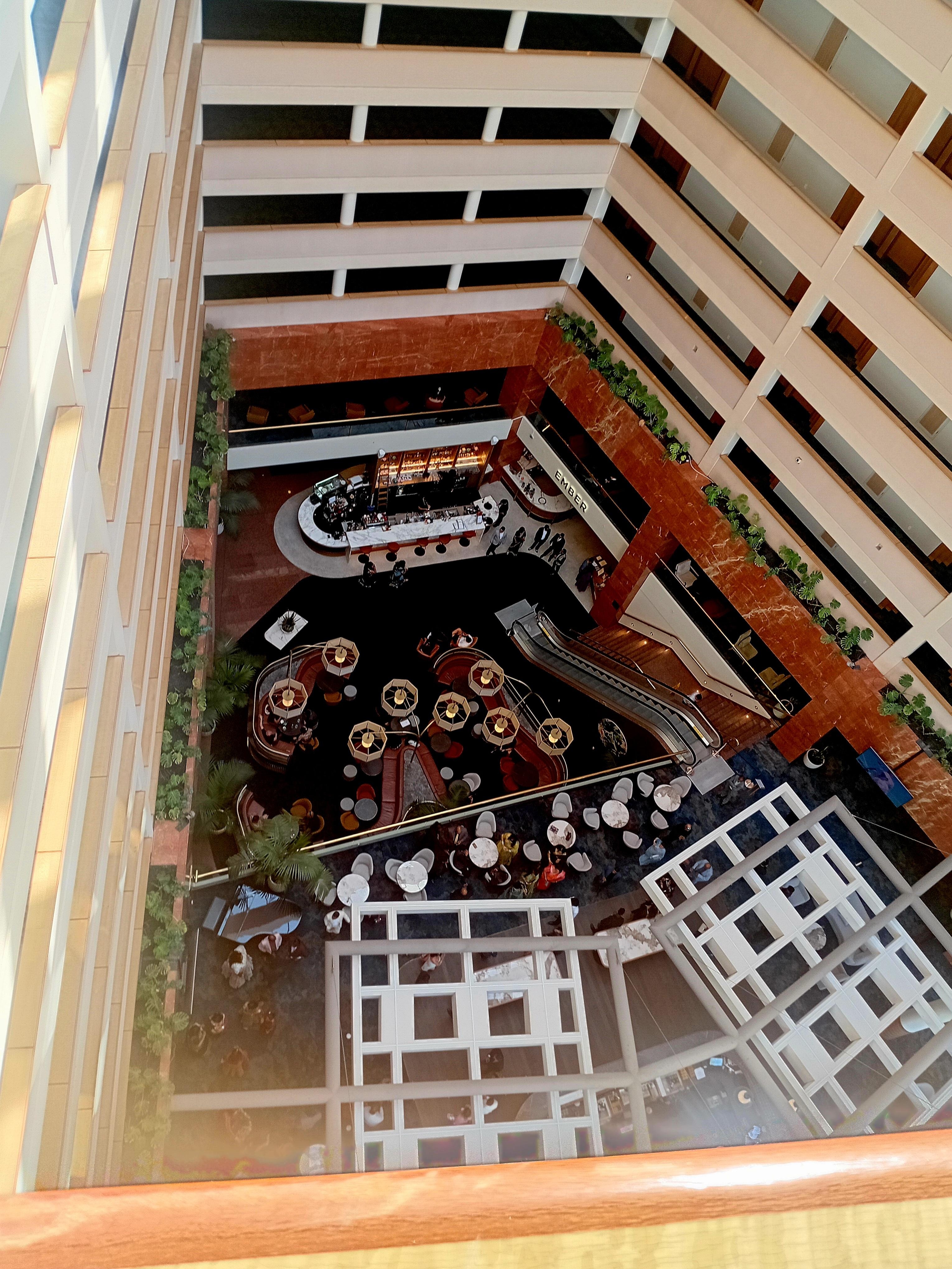 Monta hissiä, suuri aula, hotellissa uima-allas, tilava huone, erillinen aulapalvelutiski.