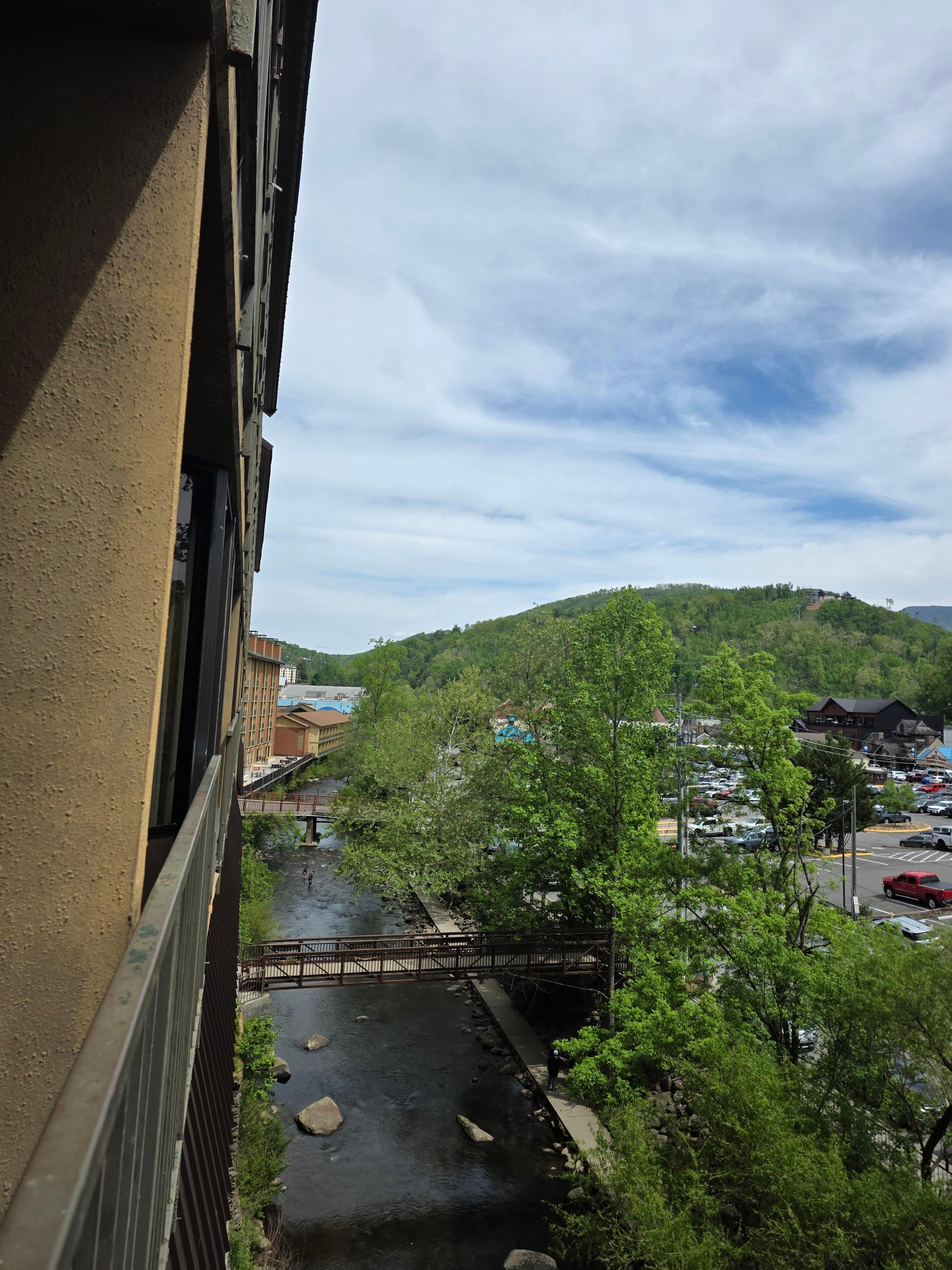 The location on the river was perfect for seeing the mountains & wild life ( including a bear) from the balcony, & also people watching and all the pretty lights on the main drag at night. Just walk across the neighboring parking lot to get to all the restaurants & activities in town. You have to pay for parking under the motel though & it's very tight & low, but it's pretty hard to find any free parking anywhere in town. Over all a nice, would stay again.