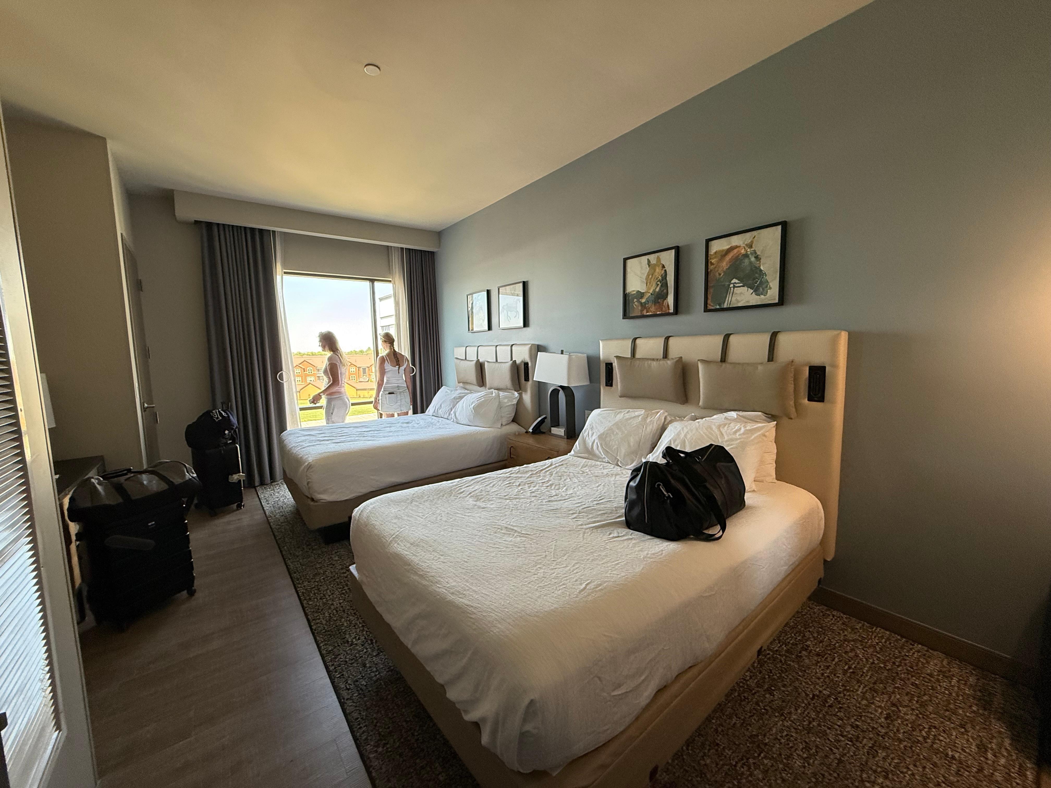 It was a family stay for Christmas. The place itself very nice. The staff, very nice. My complaints: The tv in the lounge area in our room would turn on but not allow you to see any channels, stayed on a blank help screen. Called to front desk, sent a maintenance guy up? He was nice but clueless too. Said the tech guy was on vacation. He stayed 20 mins couldn't get it figured out. I ended up googling alot on my own and got it fgiured out. Was stressful. The two queen beds appeared very nice. However, super uncomfortable. Very hard mattress. At bedtime the lights from the fountain outside were so bright. No matter how you tried closing the curtains, they dont close all the way at all.