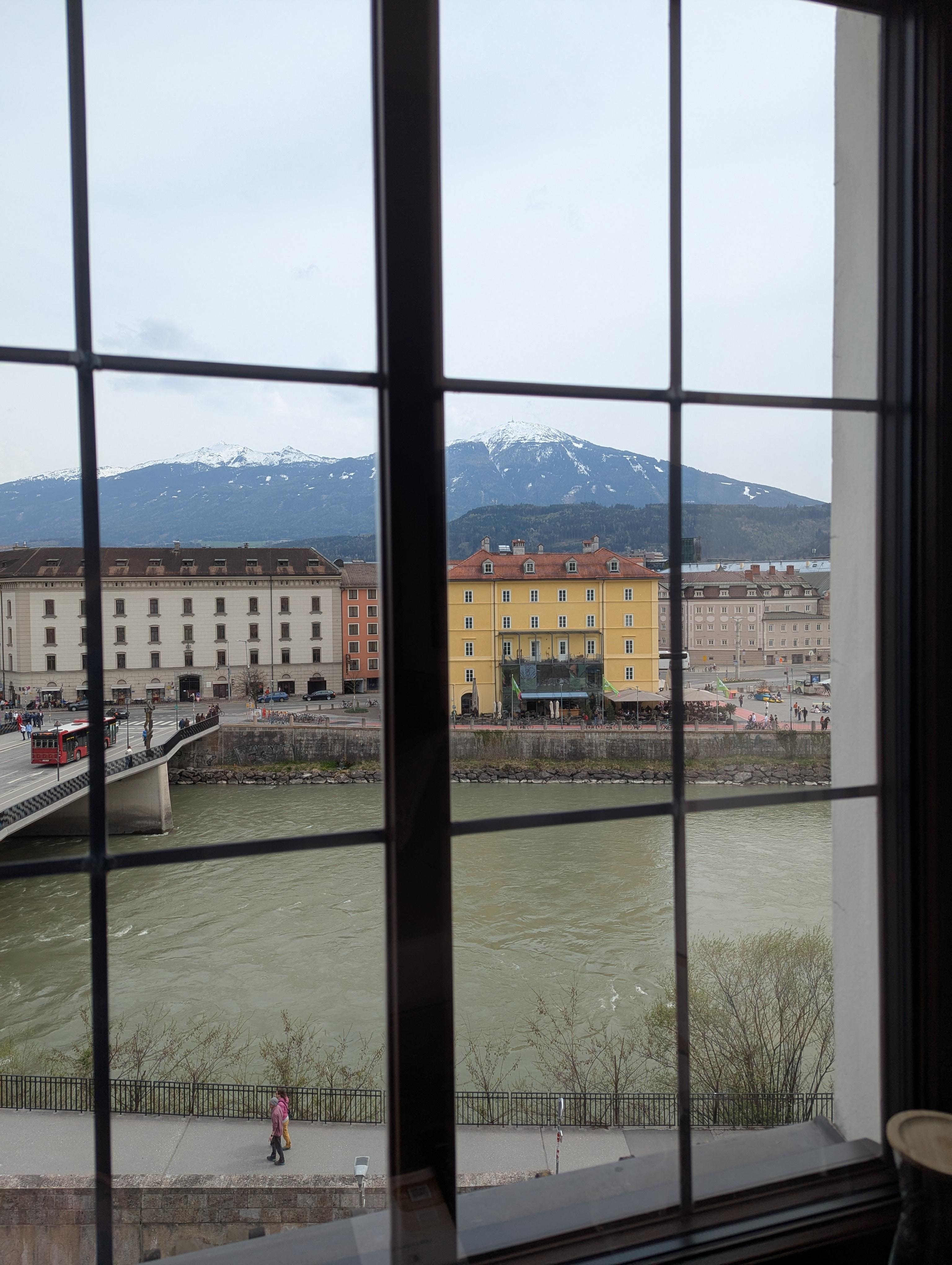 酒店在老城核心区,马路对面过因桥就是黄金屋顶,窗口看出去就是因桥。开车的小伙伴,先在酒店门口(门口30米范围都可)把行李放下,然后check in。拿到房卡后,前台会给车库地图和,拐个弯就到。用房卡刷车库门,自己把车停好就行,停车费每晚12欧。前台提供优惠券,买东西和缆车都打九折。