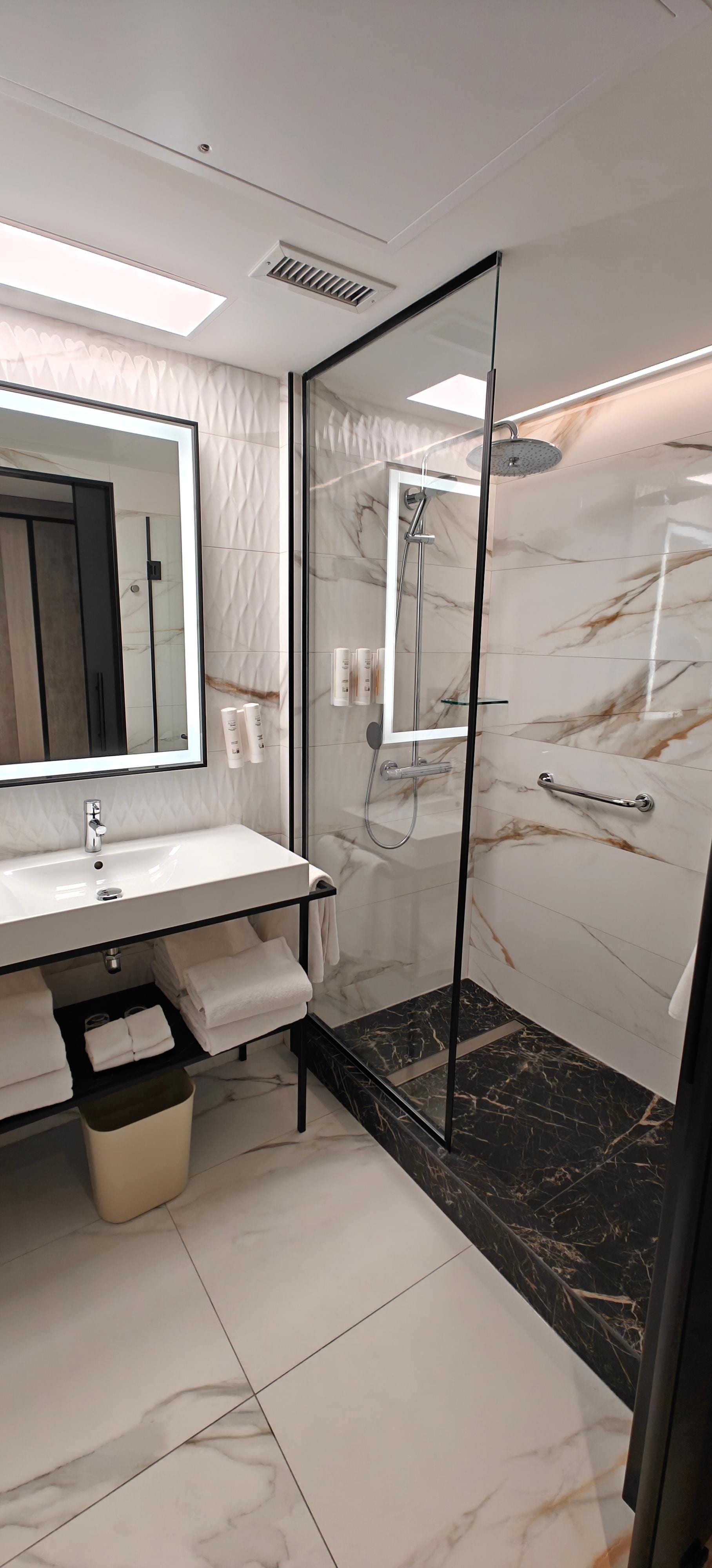 The hotel and room was very nice. Staff was wonderful. Two issues. Front desk staff takes the driver’s license number of all guests in the room. I’m not worried about the hotel having it, but not good if there is a data breach. The sliding bathroom door is nice, but quite noisy when someone uses it in the middle of the night.