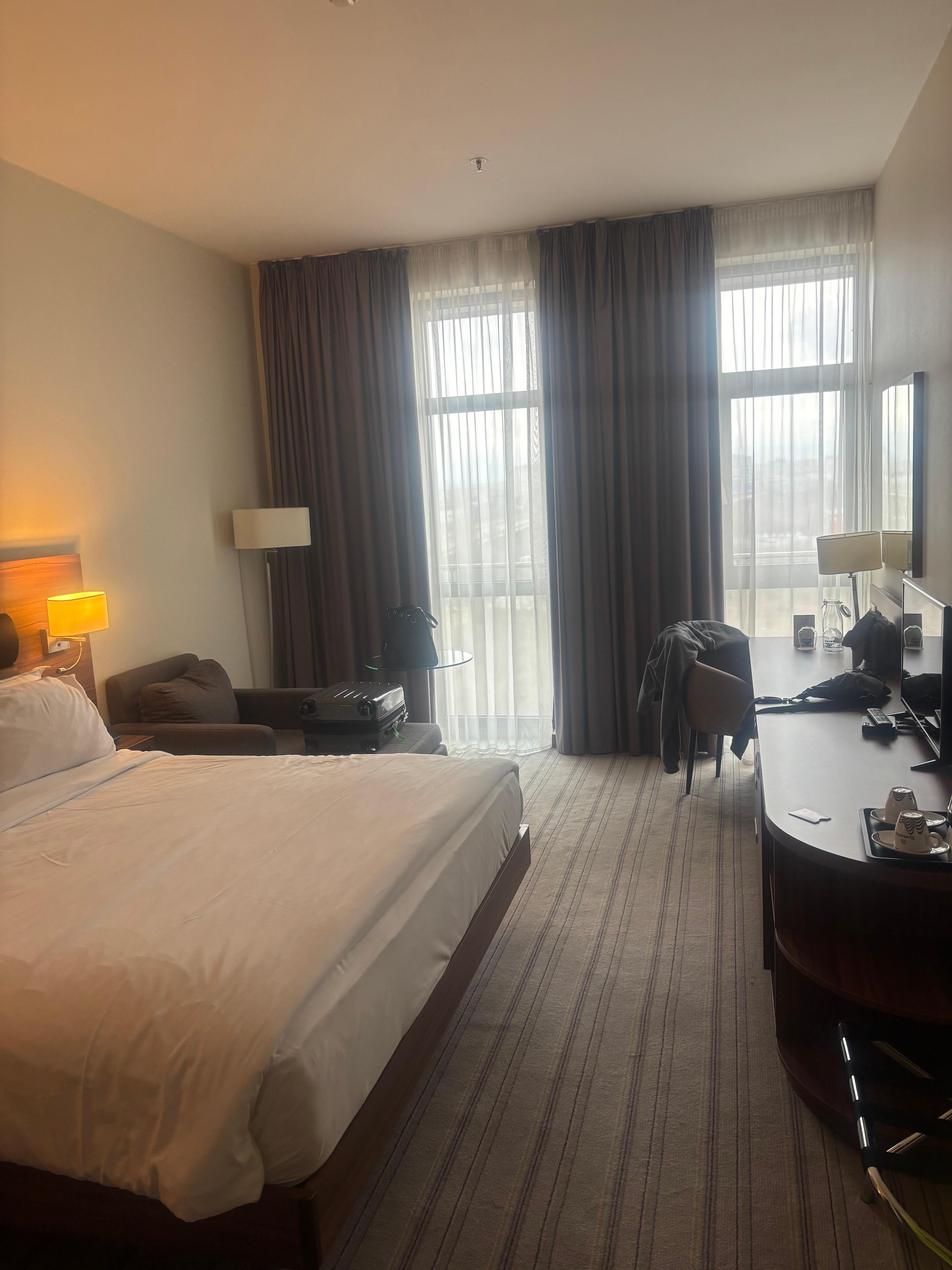 酒店房間寬躺舒適,距離機場只需約5分鐘車程。如需要乘座來往酒店的免費巴士,必須先於酒店官方網頁預約,大約半小時一次。留意機埸並沒有巴士站的牌子,要留意
